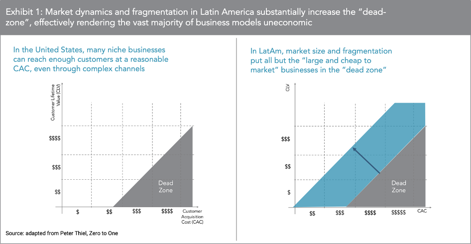 In Latin America, the complexities of the market combined with the economic reality mean that it is extremely difficult for niche businesses to reach customers at a reasonable acquisition cost, making market entry just too expensive and the returns just too low for businesses without cheap, high volume models (see Exhibit 1).